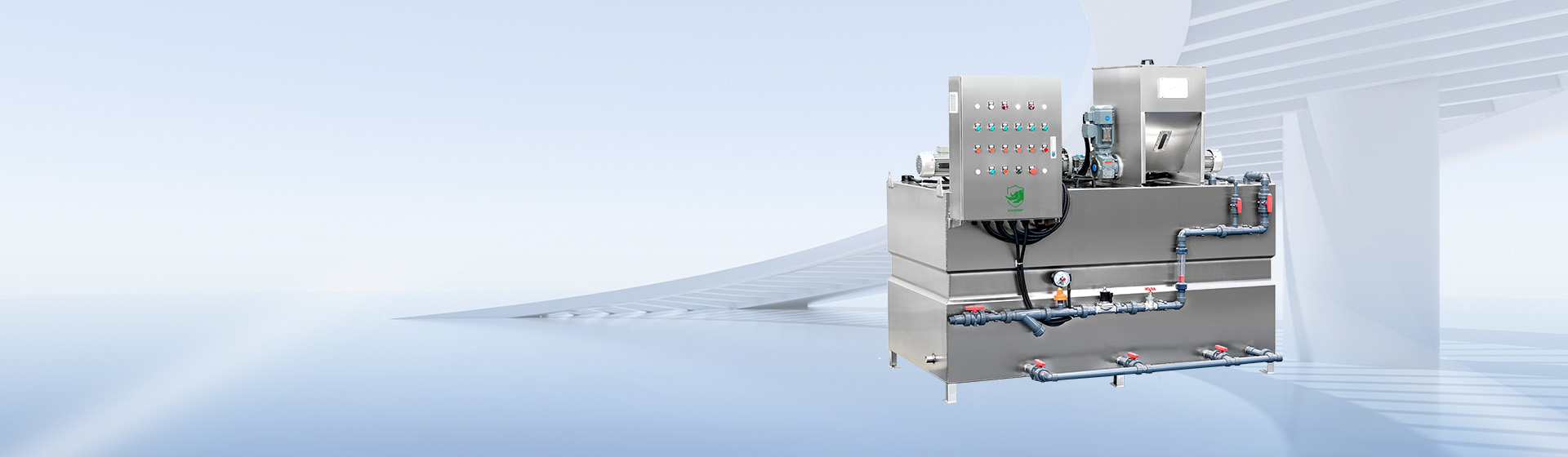 工作流程:料斗中的粉狀劑經(jīng)定量供料裝置送入混合器中,與水進(jìn)行混合后進(jìn)入溶液箱中,混合液經(jīng)攪拌后形成均一濃度的溶液,再進(jìn)入貯液箱內(nèi),經(jīng)計(jì)量泵投加至加點(diǎn)。