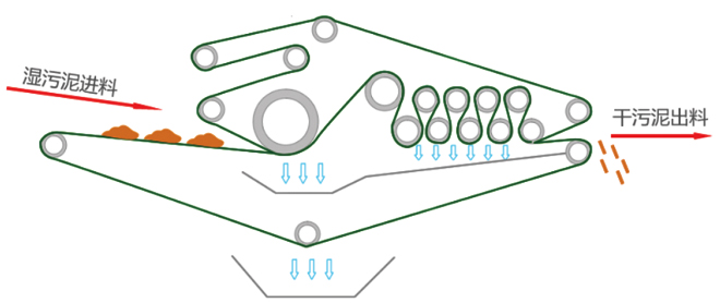 工作原理:通過(guò)對(duì)含水率80%左右的污泥進(jìn)行化學(xué)調(diào)質(zhì)改性處理后再高壓擠壓脫水至含水率60%以下,KTSD壓濾脫水機(jī)是由上下兩條張緊的濾帶夾帶著污泥層,從一連串有規(guī)律排列的輥壓筒中呈S型經(jīng)過(guò)依靠濾帶本身的張力形成對(duì)污泥的擠壓和剪切力,把污泥層中的毛細(xì)水?dāng)D壓出來(lái),獲得含固率較高的泥餅,從而實(shí)現(xiàn)污泥的脫水。
